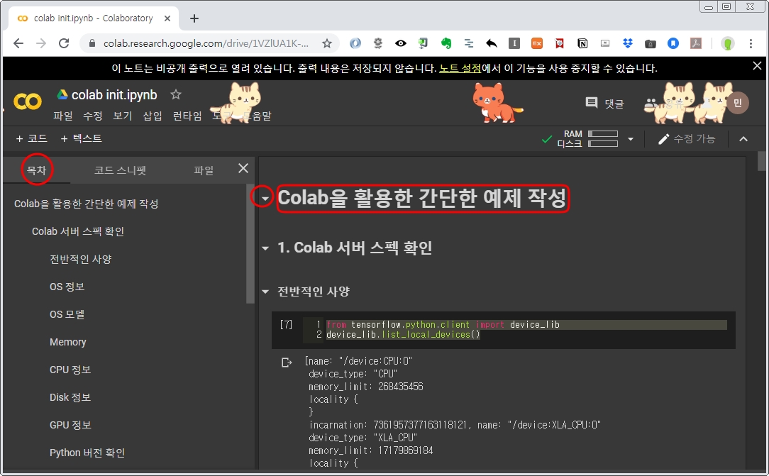 자! 이것으로 Colab 환경설정은 끝났다. 너무 쉽지 않은가? 이제 간단한 예제를 작성해보자.