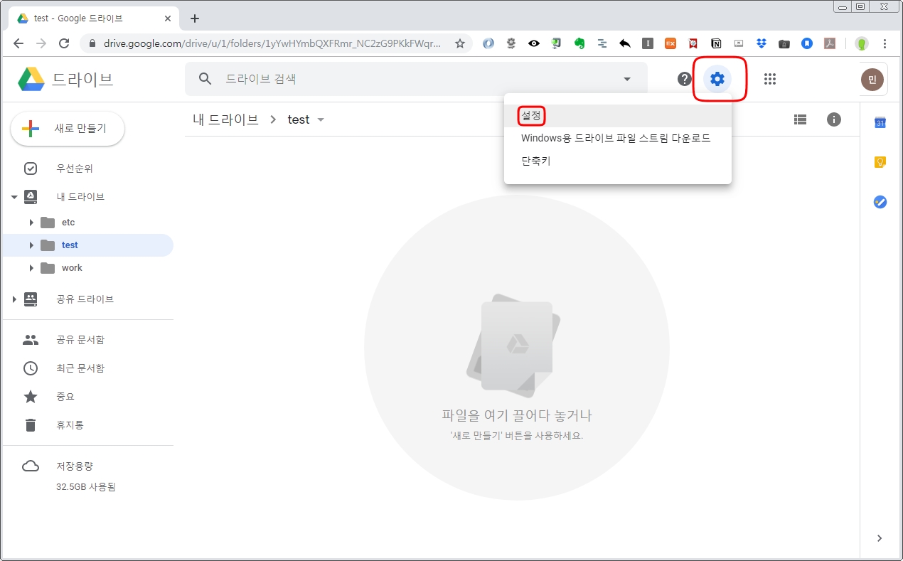 - 드라이브 메인화면으로 이동 > 톱니바퀴 모양 버튼 클릭 > 설정을 클릭한다.