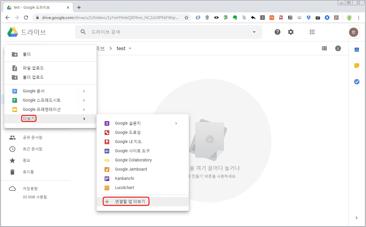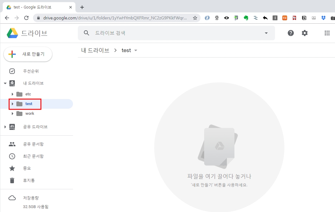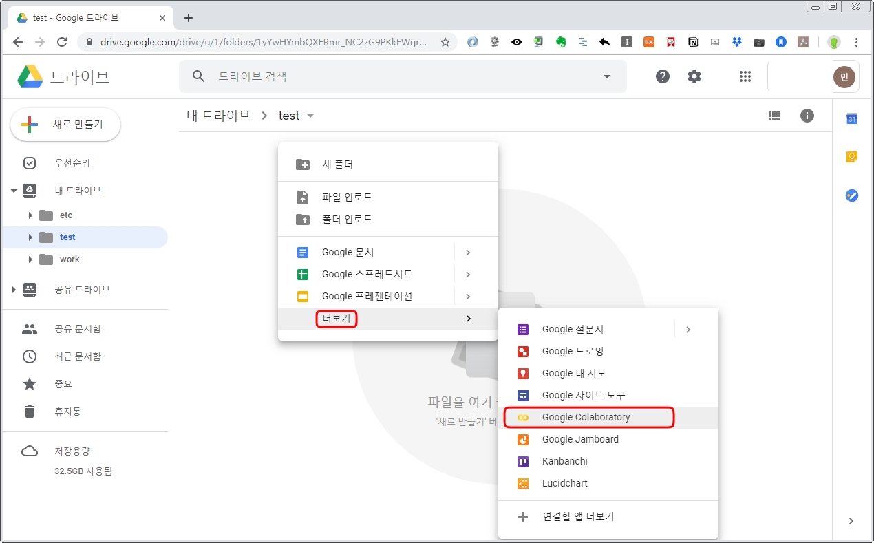 - https://drive.google.com에 접속 후, 우클릭하여 다음과 같이 test 폴더를 만든다.