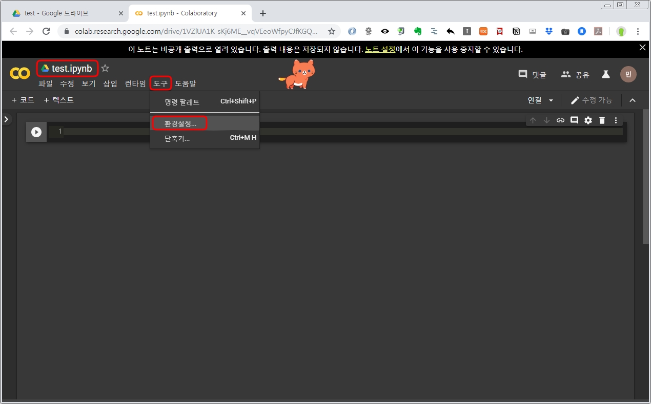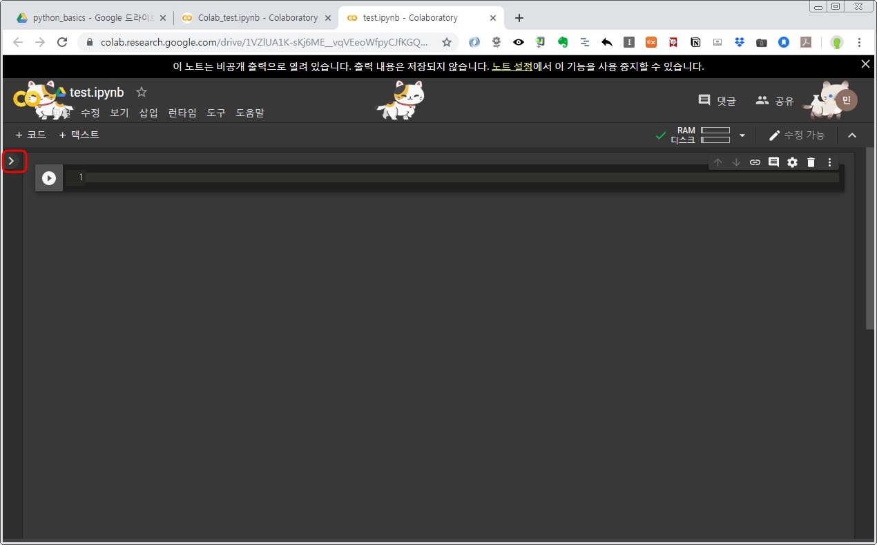 - 소스코드는 .ipynd 확장자로 구글 드라이브에 안전하게 보관되므로 걱정할 필요없다.