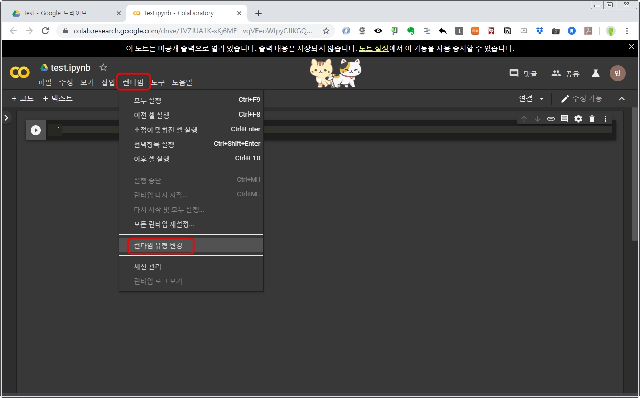 - 상단 메뉴 런타임 > 런타임 유형 변경을 클릭한다.