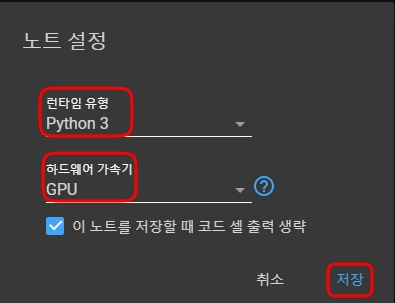 - 런타임 유형은 Python3를, 가속기는 GPU를 선택 > 저장을 클릭한다.
