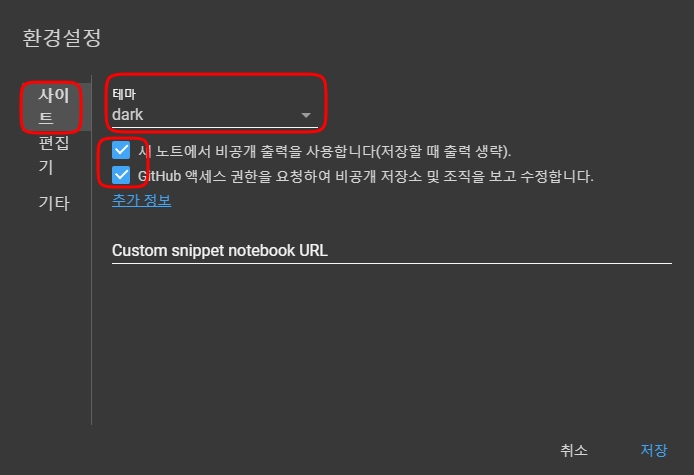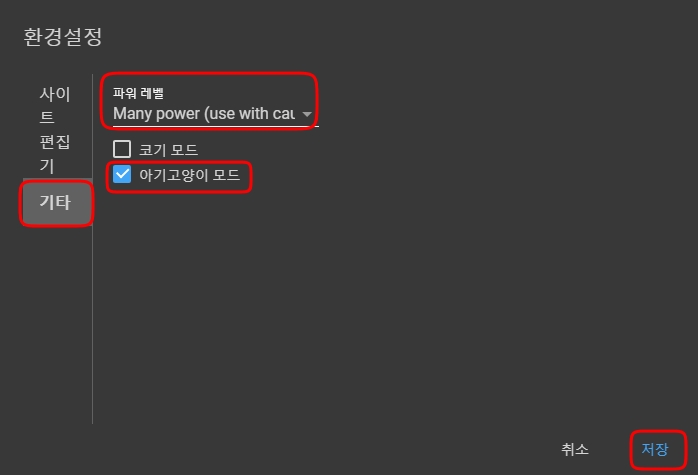 - (좌측) 기타 탭 클릭 > 원하는 설정을 적용 > 저장을 클릭한다.