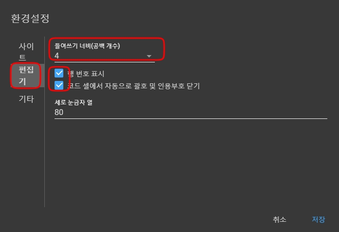 - (좌측) 편집기 탭 클릭 > 들여쓰기 4선택 > 체크박스 2개 체크