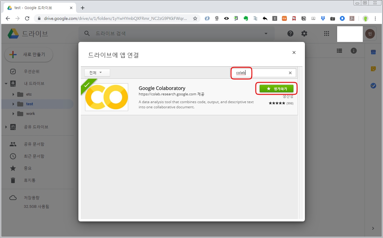 - 새로 뜬 팝업의 우측 상단에 colab이라는 검색어를 입력하면 아래 그림과 같이 Google Colaboratory 앱이 등장한다. 검색어 바로 밑에있는 녹색 연결하기 버튼을 누른다. (필자의 경우 이미 연결했기 때문에 평가하기 버튼으로 보이고 있다.)