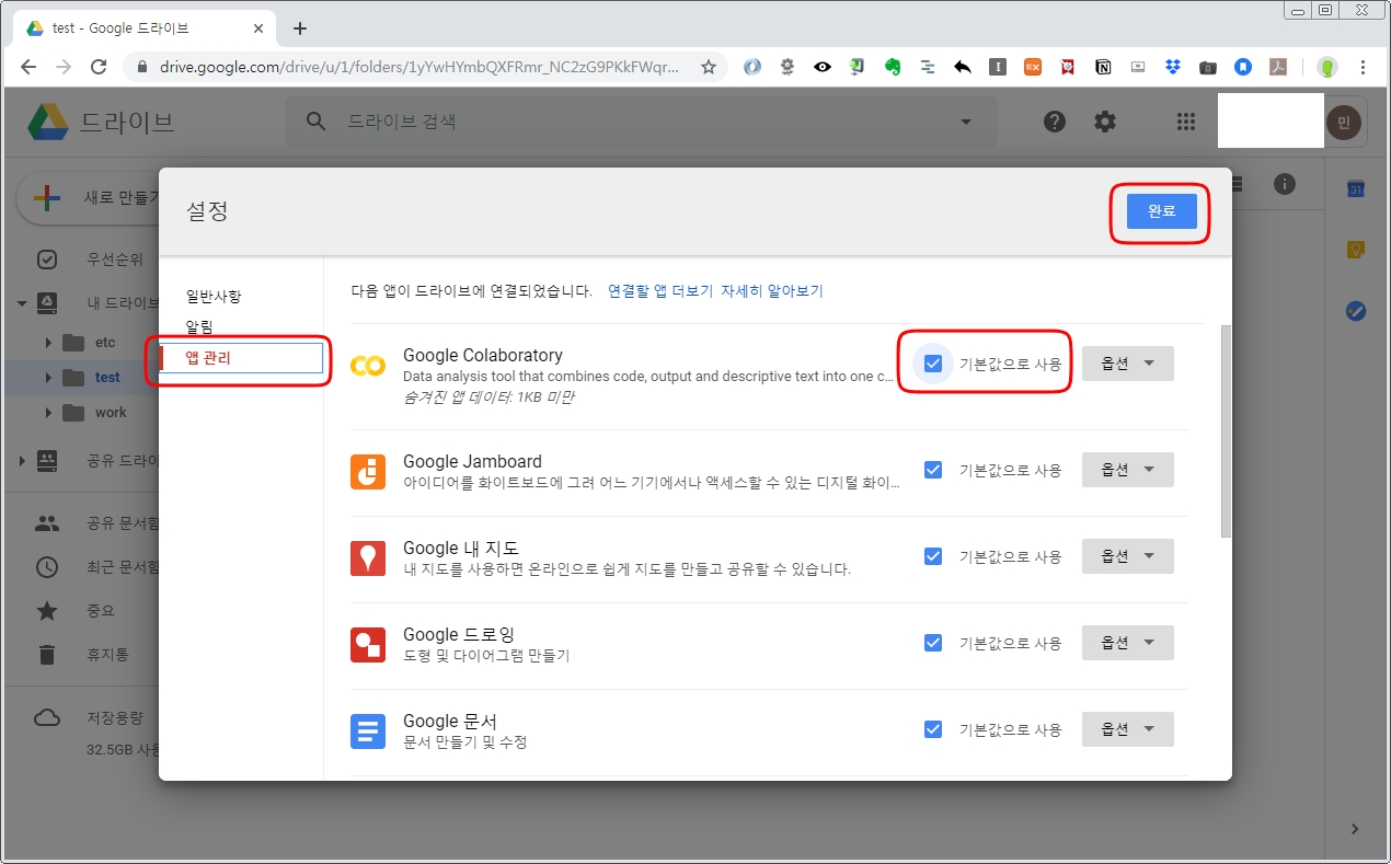 - 새로 뜬 팝업의 좌측 메뉴 앱관리 클릭 > Google Colaboratory 우측의 기본값으로 사용 체크박스 클릭 > 완료를 클릭한다.