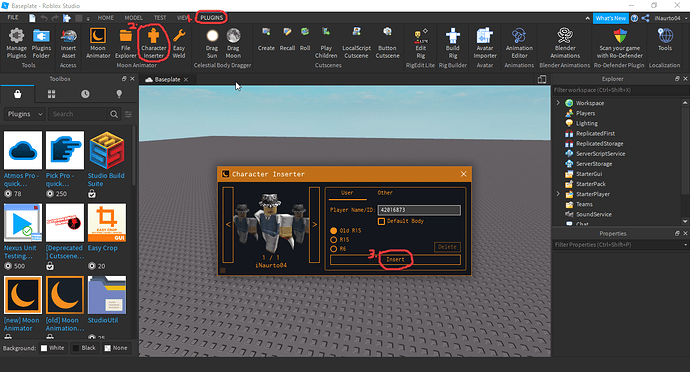 To insert a character, first head up to the Plugins tab, second, click the Character Inserter button, and third, just insert a character (Gotta pick R6 version BTW).