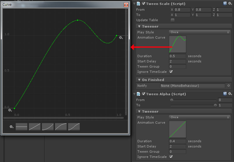 위의 팝업 연출에서 사용한 것은 NGUI Tween Scale 과 Tween Alpha 이다. 각각의 컴포넌트를 추가하고 알앚게 옵션만 조절하면 된다. 특이한점은 iTween 에서는 이징을 정해진 값을 사용했지만, NGUI Tweener 에서는 커텀으로 제어할 수 있다는 점이다. 대화상자 UI가 바운스하는 느낌을 연출하기 위해 이징 그래프를 굴곡이 생기게 만들었다.
