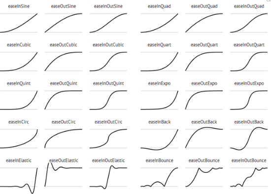 위 그림은 시간당 변화량을 그래프로 표현한 이징종류들이다. 해시 테이블의 "easeType"는 위 그림에서 하나를 선택할 수있다. 오브젝트를 트윈할 때 좀더 자연스럽고 다이나믹한 연출을 할 수있다.