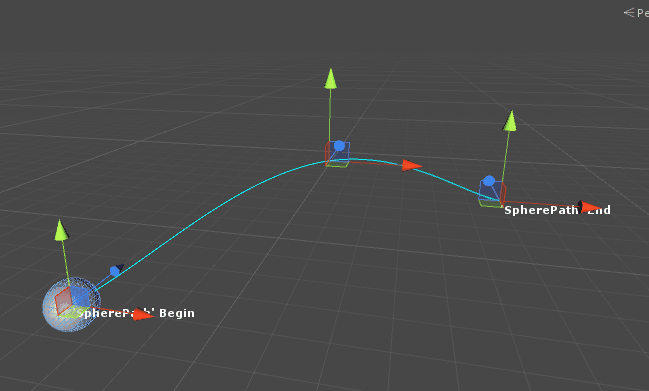 추가한 iTween path컴포넌트에서 path visible 이 체크되어있다면 위의 그림처럼 경로를 불 수있다. Path Name은 iTween path를 사용하는 다른 오브젝트와 구분하기위한 이름이다. path color 값으로 경로의 색을 지정할 수있다. 이 선은 Scene 뷰에서만 보이고 Game 뷰에서는 보이지 않는다. Node Count는 기본적으로 2개지만 포물선 움직임을 위해 3개로 설정하였다. 2개만 사용할 경우에는 굳이 iTween path를 사용하지 않고 그냥 iTween 만 사용해도 된다. 각각의 노드위치 값들을 바탕으로 포물선이 만들어지게 된다. 그리고 게임 오브젝트는 이 포물선을 따라 움직이게 된다.