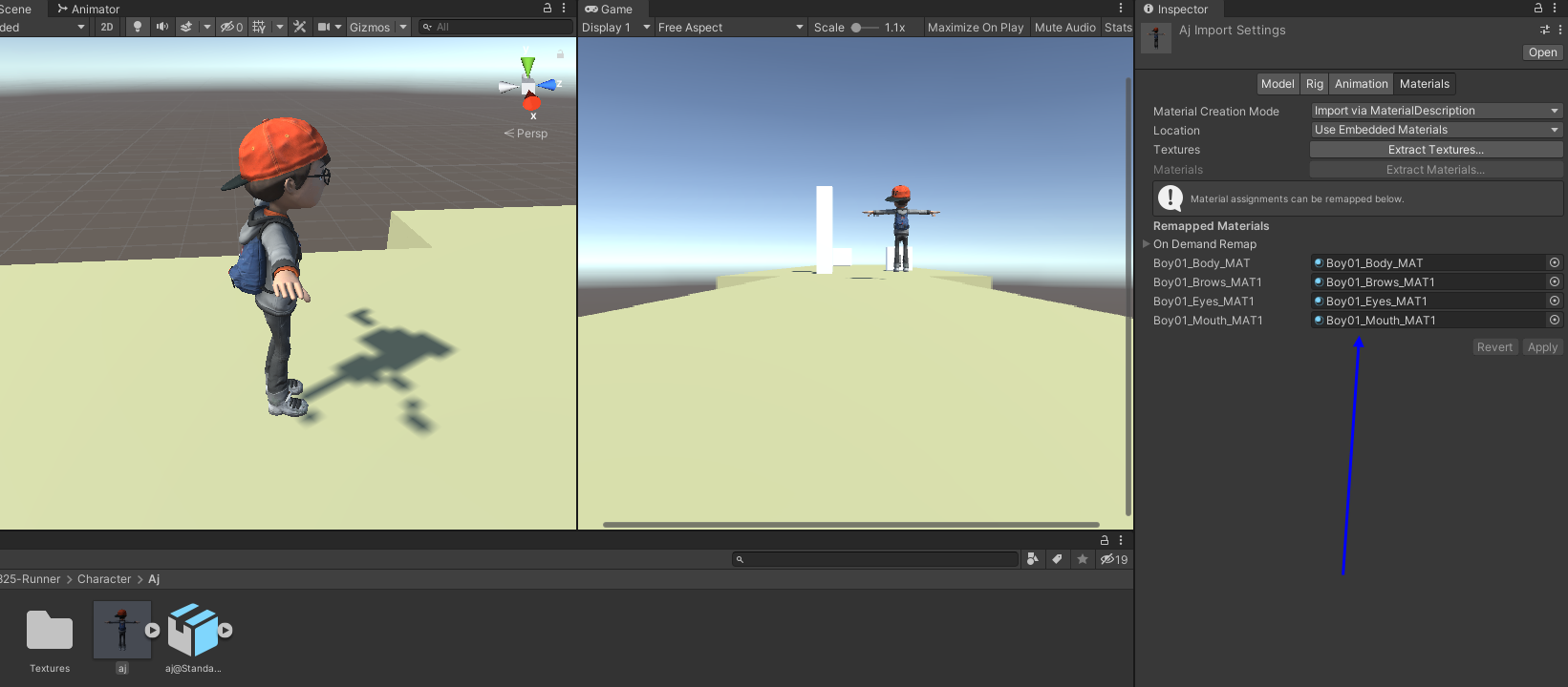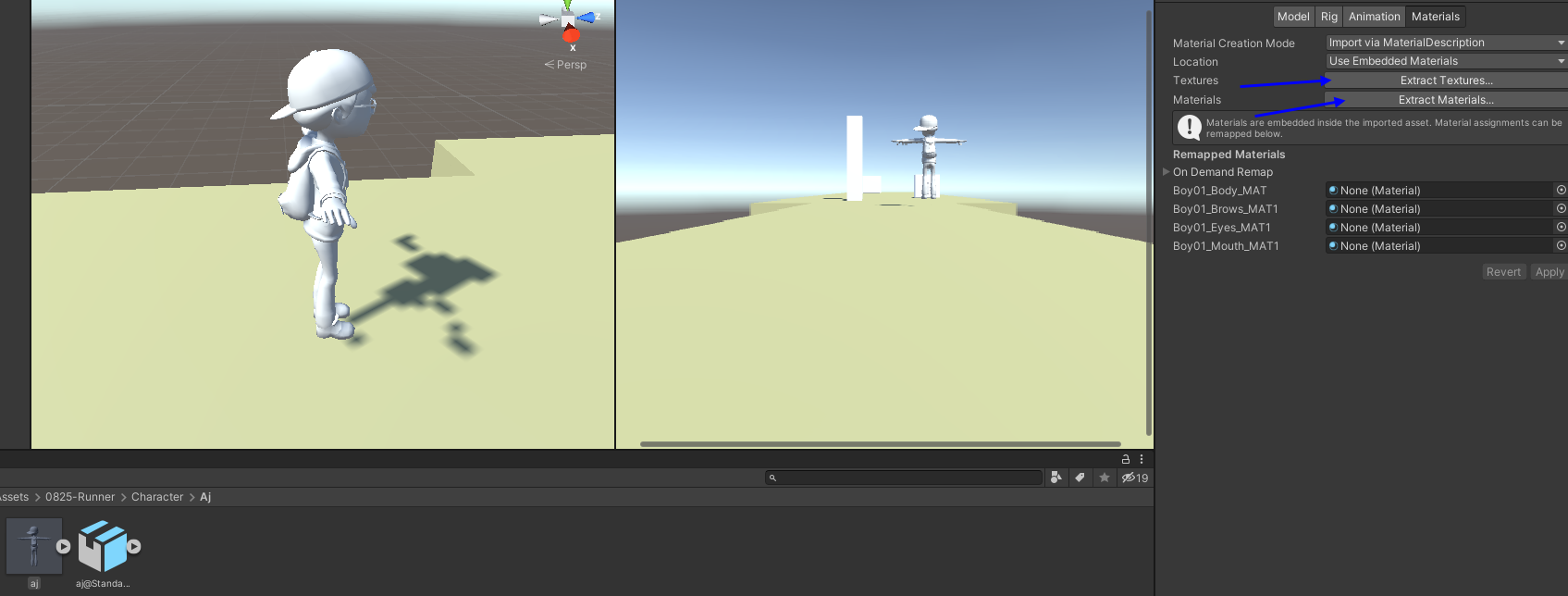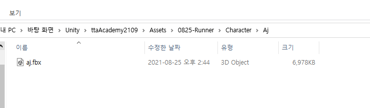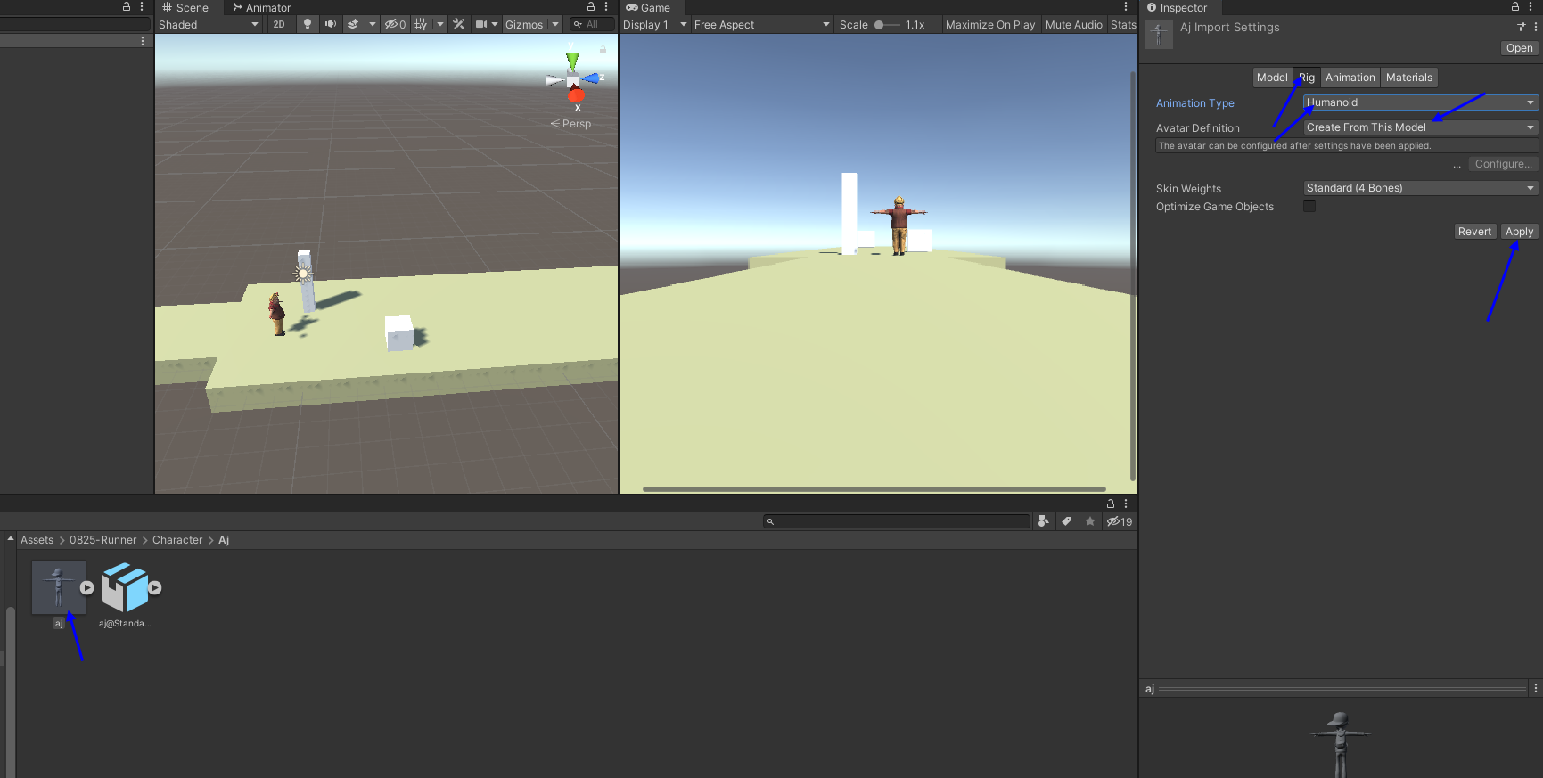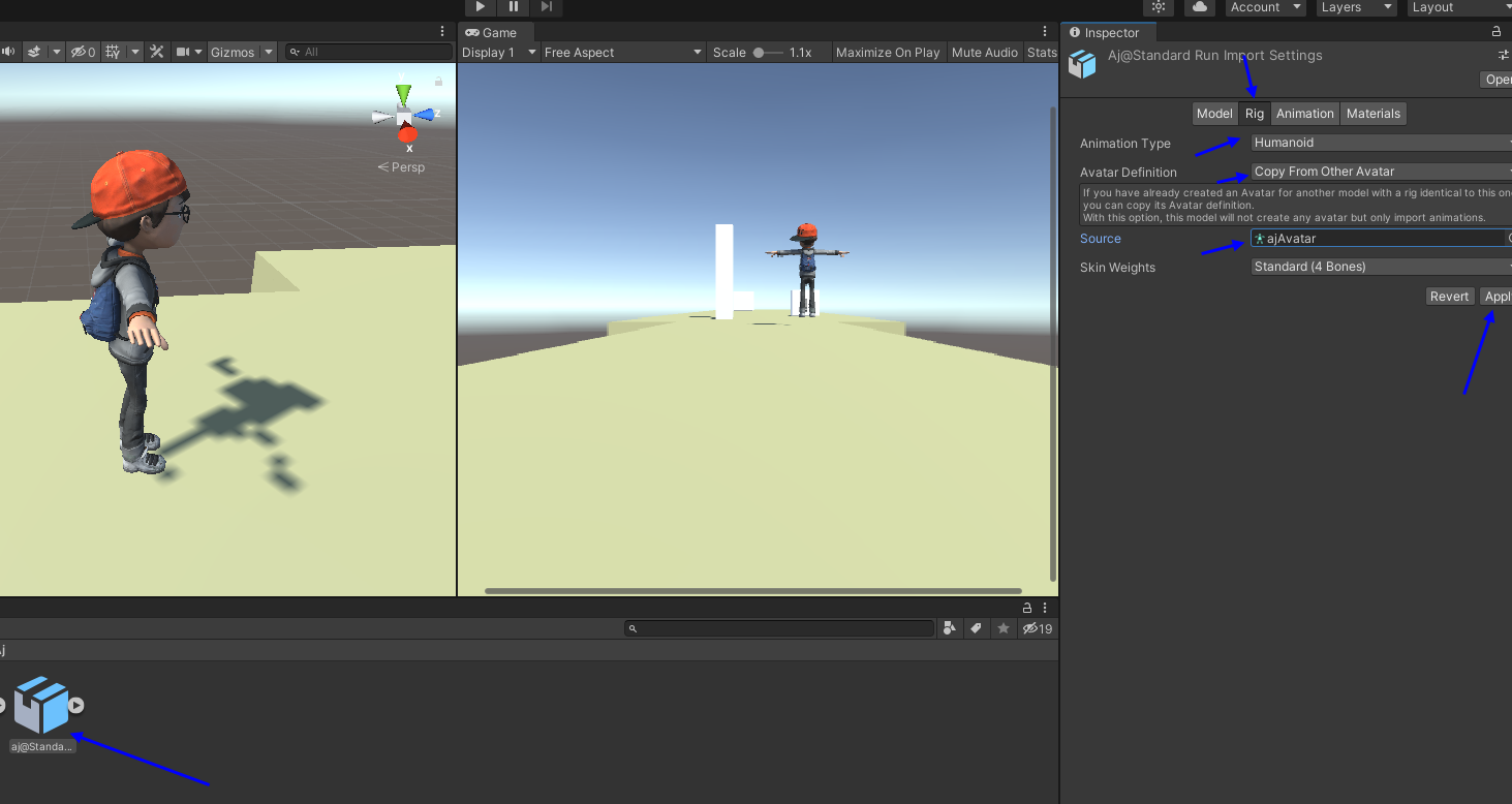 aj.fbx 클릭하여 inspector에서 rig 설정 해줌 (Humanoid, Create From This Model), Apply 적용