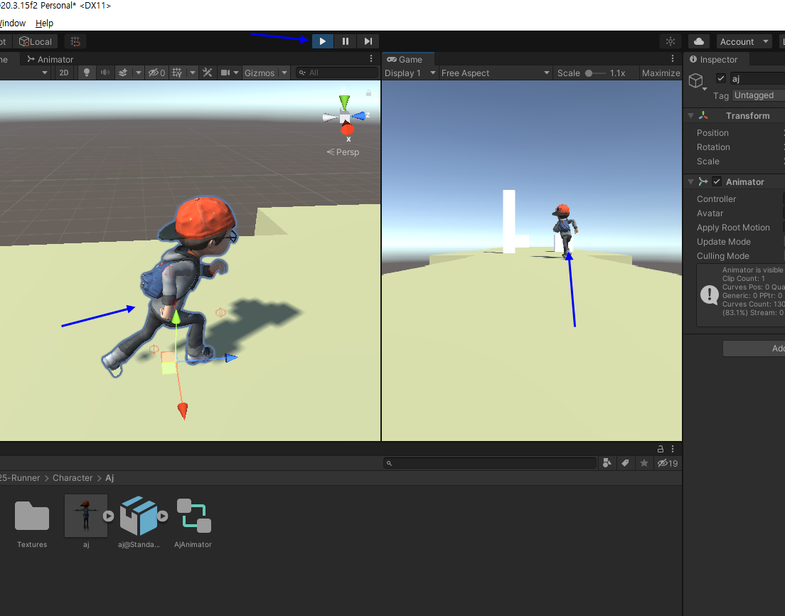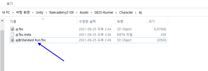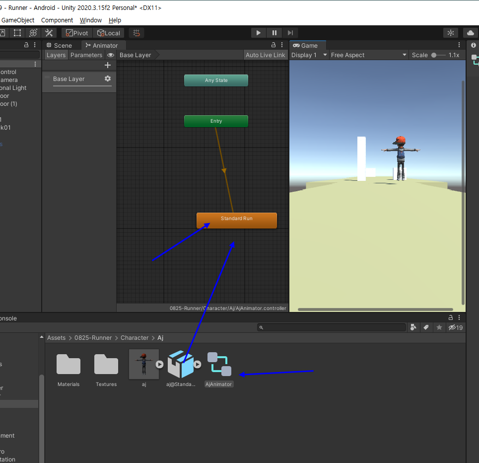 AjAnimator를 더블클릭하면 Animator창에 Standard Run 을 드래그앤 드랍하면 됨