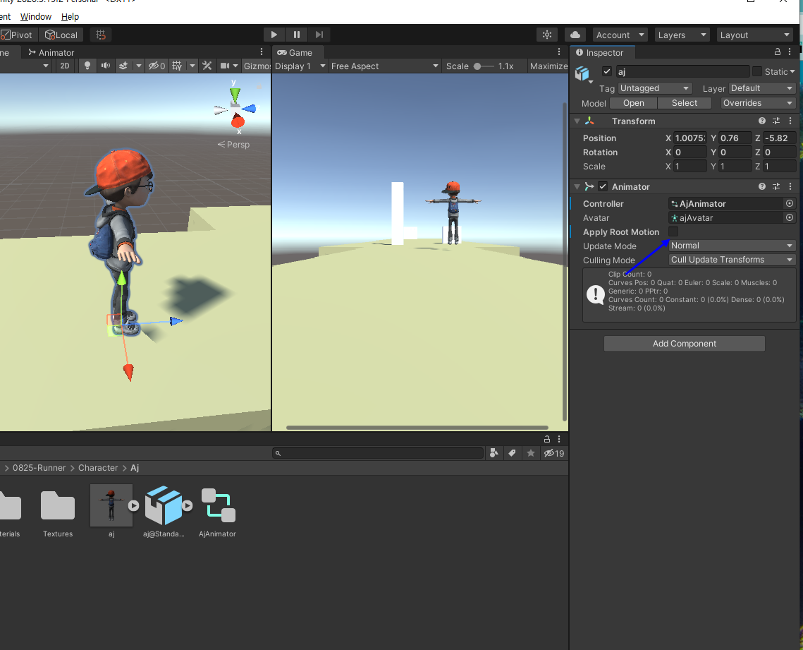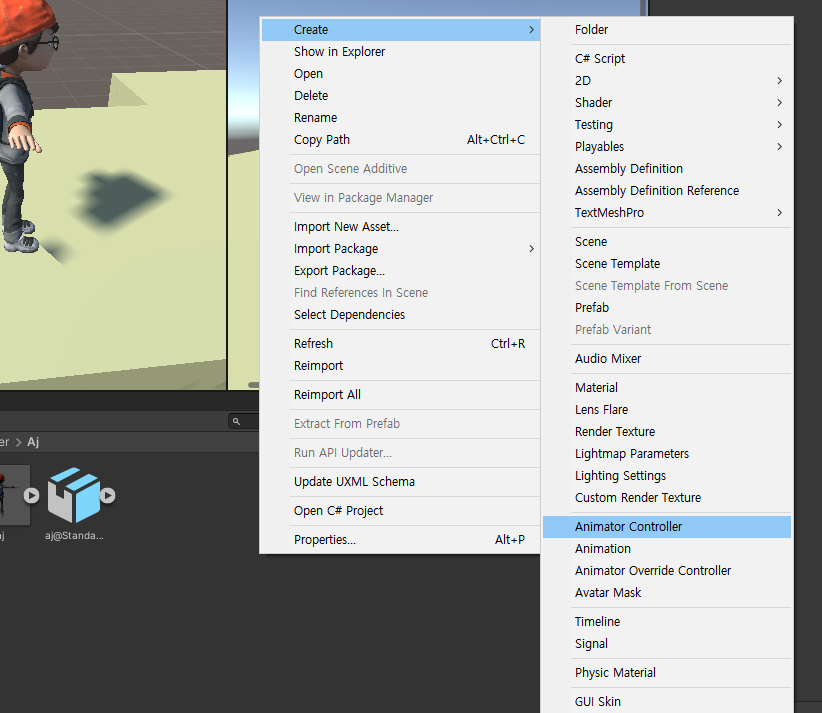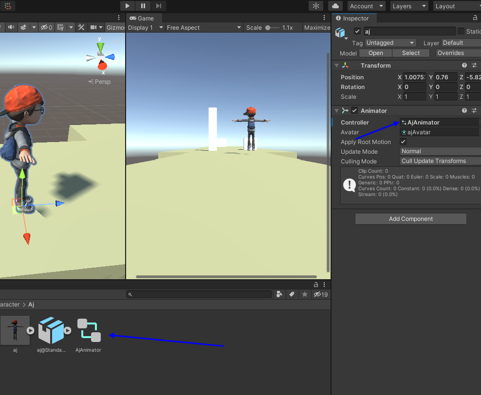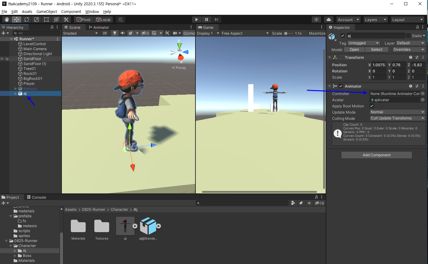 Animator Conroller (None)으로 되어 있어 AjAnimator라고 Create해주고 연결해줌