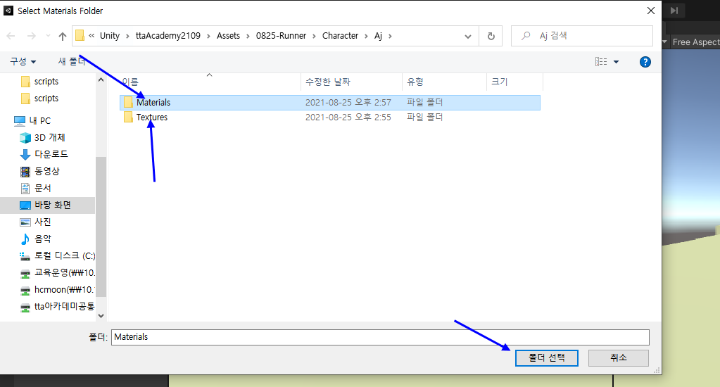 Textures, Materials 폴더를 생성하여 각각 버튼 클릭
