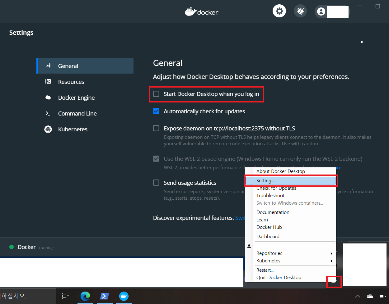 NOTE : 도커 설정에 들어가서 작업표시줄의 도커 아이콘으로 설정에 진입, General설정에서 Start Docker Desktop when you log in 체크 해제