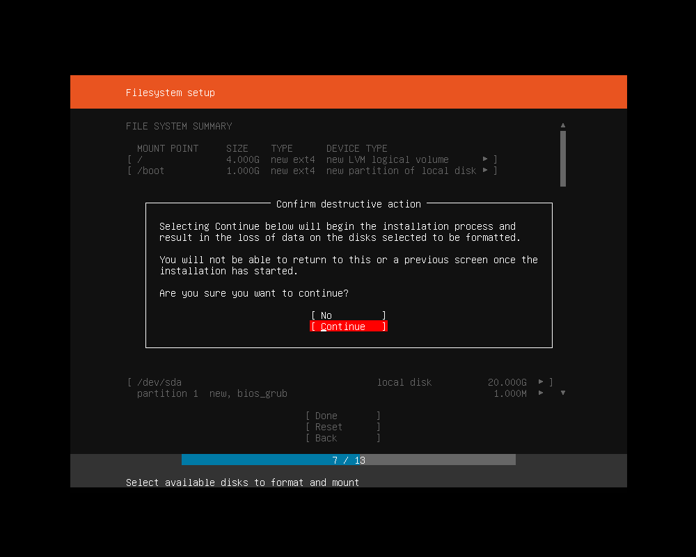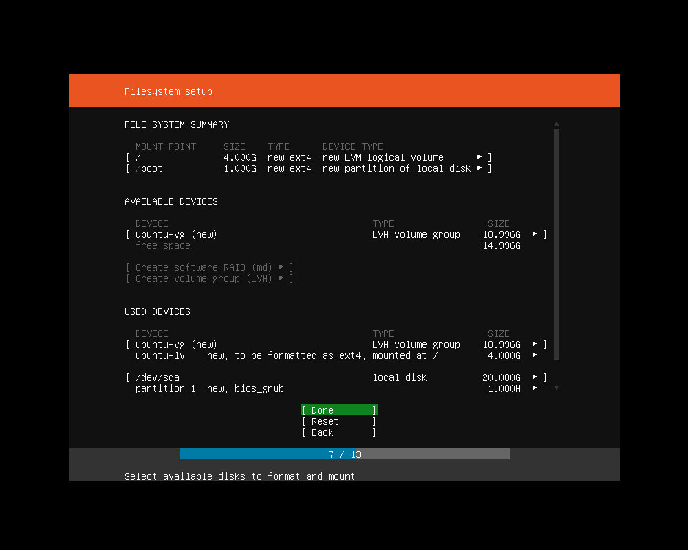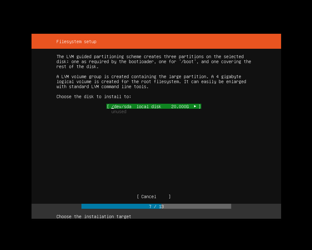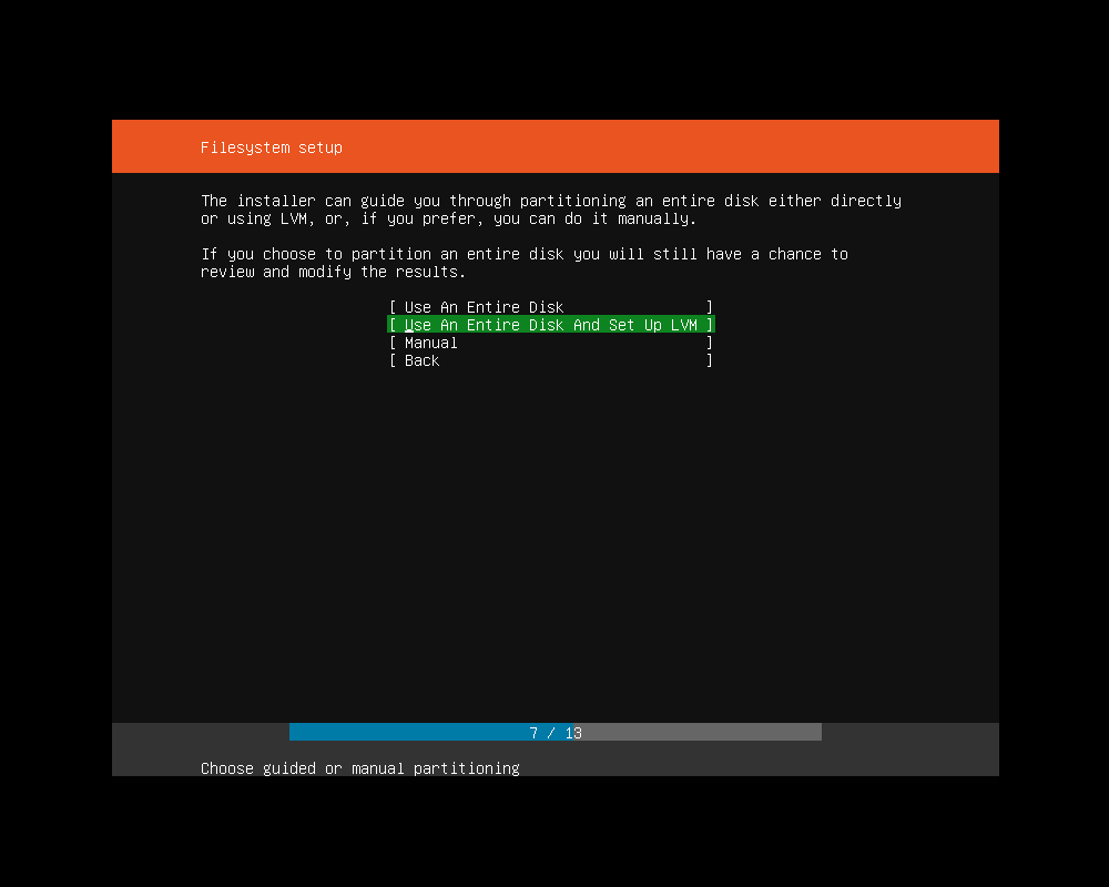 - Filesystem을 설정합니다. ‘Use An Entire Disk and Set Up LVM’을 선택합니다.