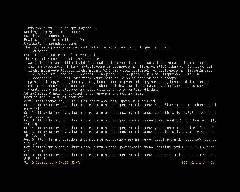 - ‘apt upgrade’ command로 업그레이드 가능한 모든 패키지를 업데이트합니다.