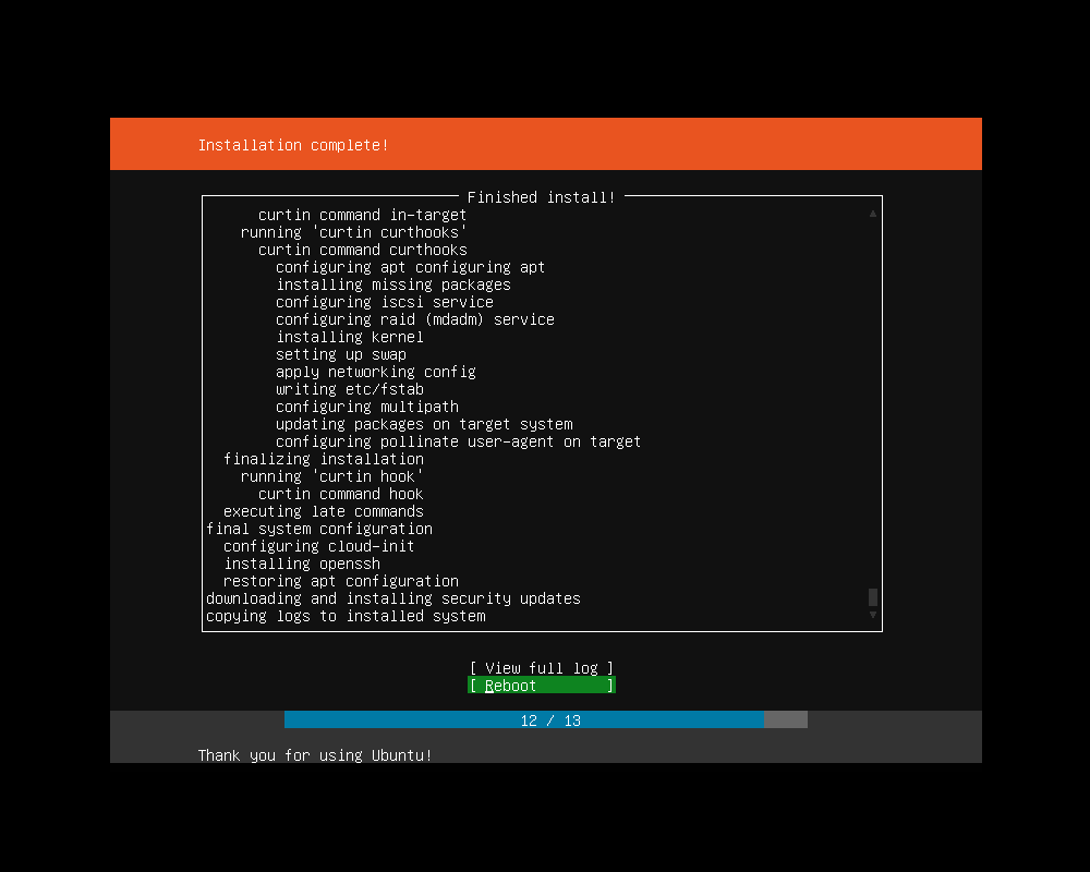 - 설치가 완료되었습니다. ‘Reboot’를 선택합니다.