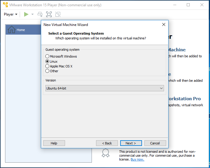 - Select Linux as the Guest operating system and Ubuntu 64-bit as the Version.