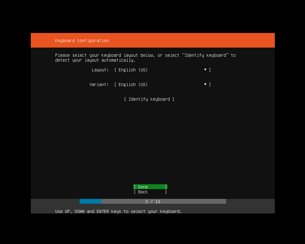 - Keyboard layout을 설정합니다. ‘English (US)’를 선택합니다.