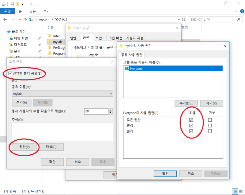 1-3) 고급 공유창에서 선택한 폴더 공유를 체크하고, 권한을 눌러 모든 권한을 허용