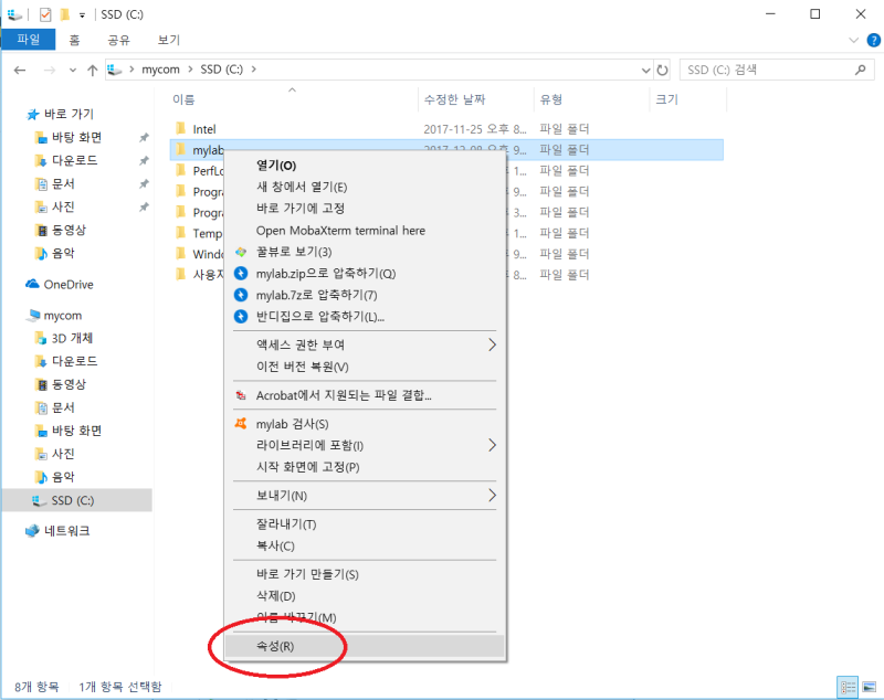 1-1) 윈도우에서 공유하고자 하는 폴더에 대하여 마우스 오른쪽 클릭을 하고 속성을 선택