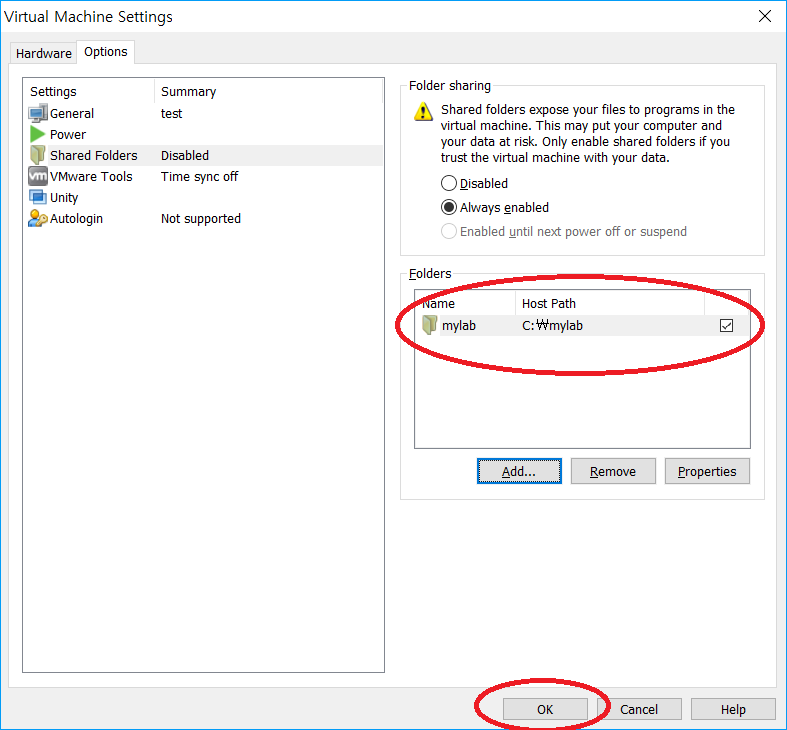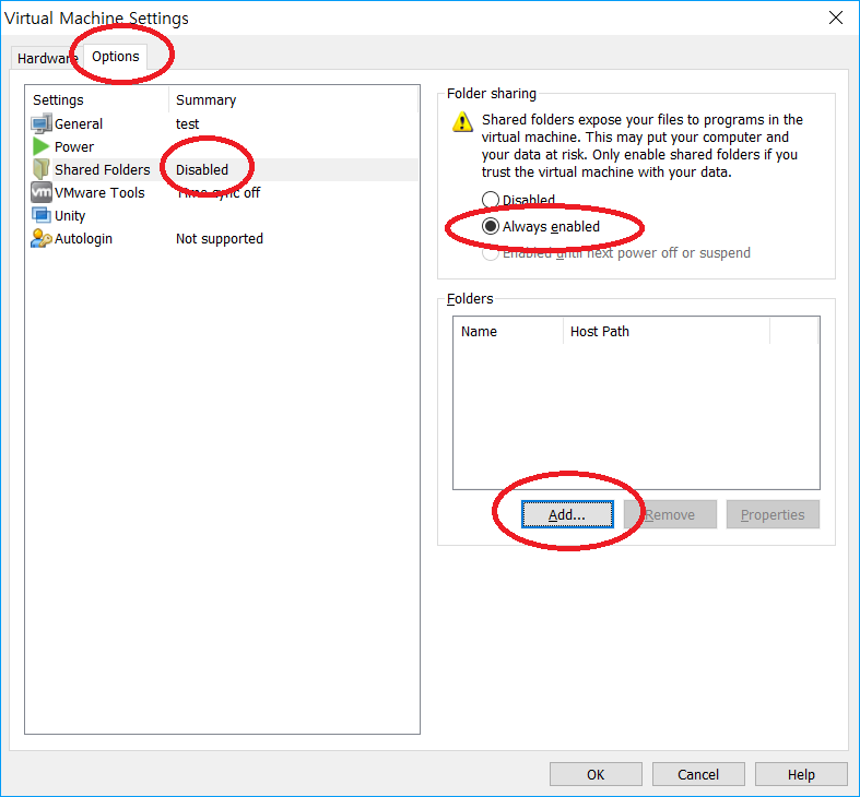 2-2) Options 탭에서 Shared Folders 항목을 선택하고, Always enabled를 체크한다. Add를 눌러 윈도우에서 공유하고자 하는 폴더를 선택한다.