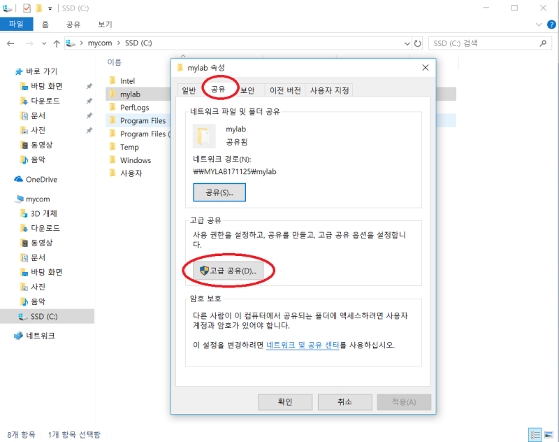 1-2) 속성에서 공유탭 - 고급 공유를 클릭한다.